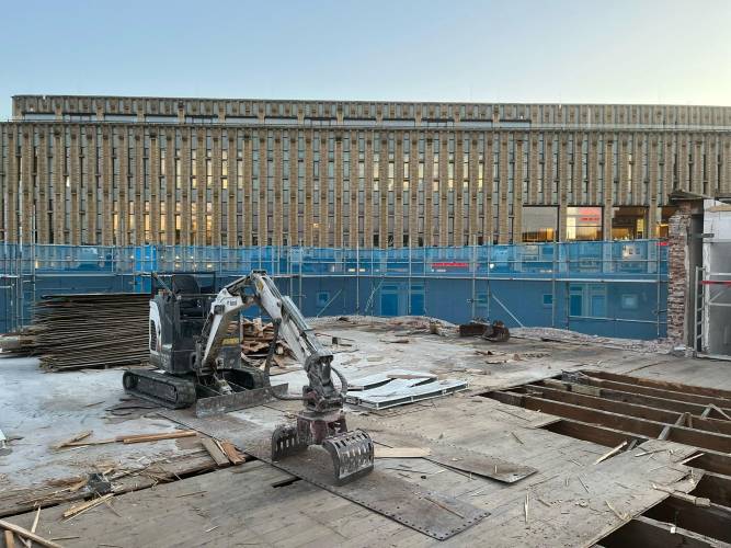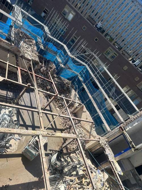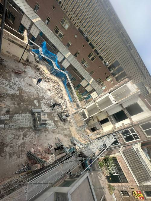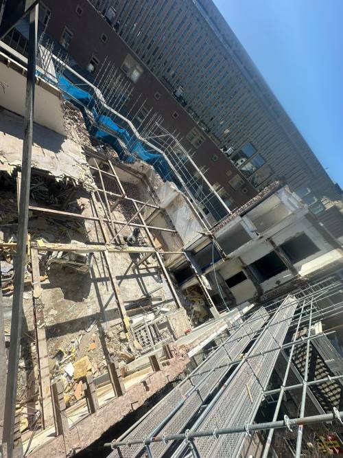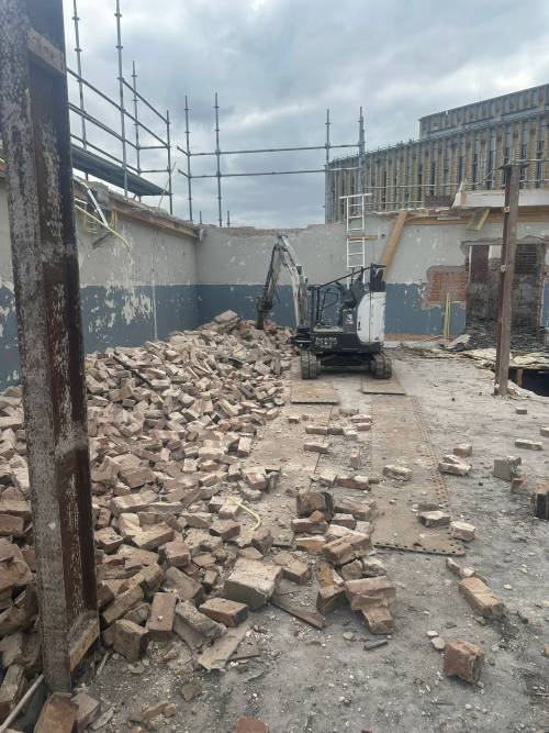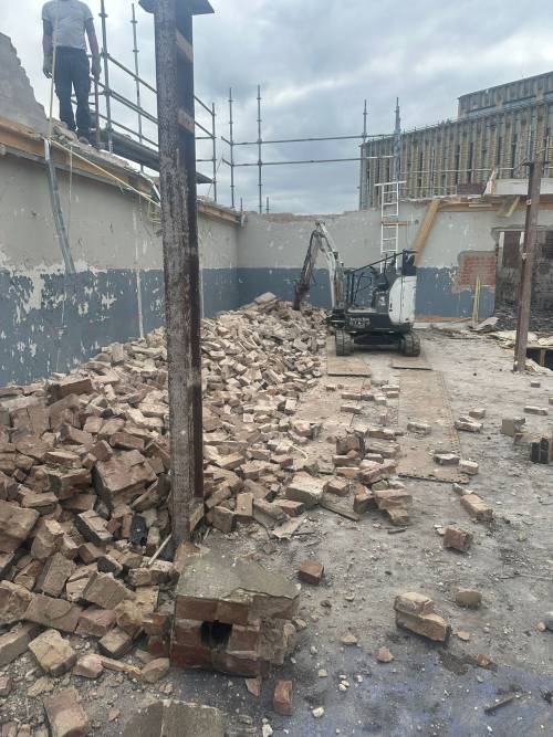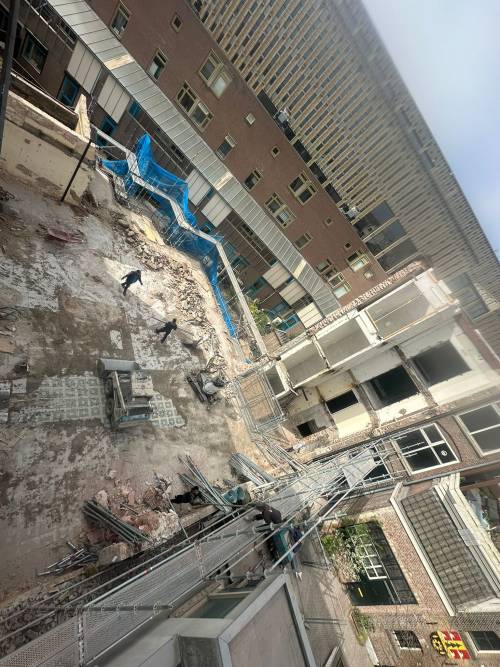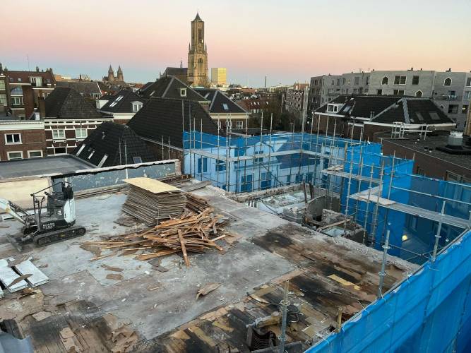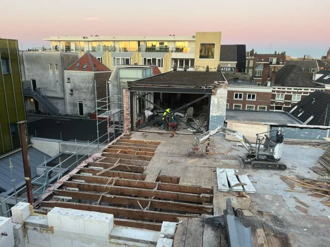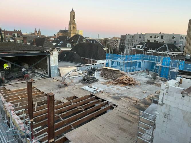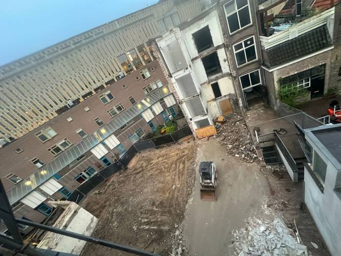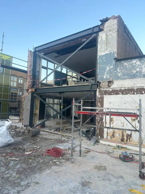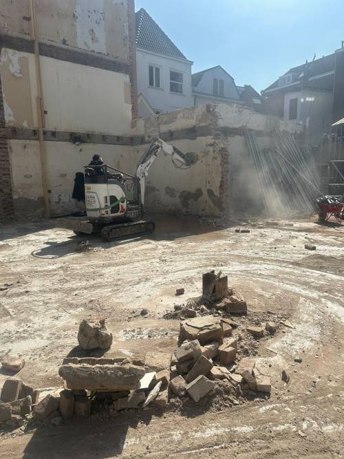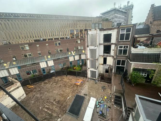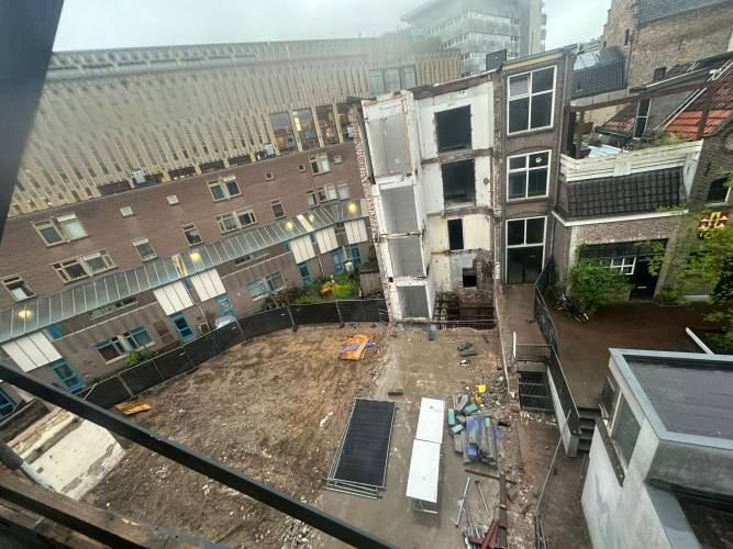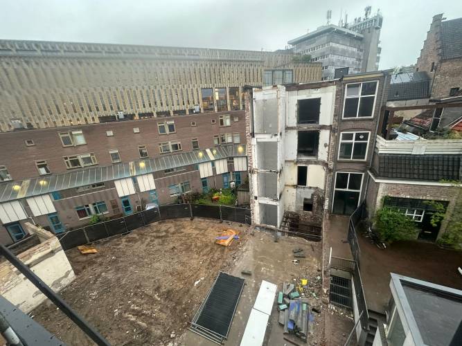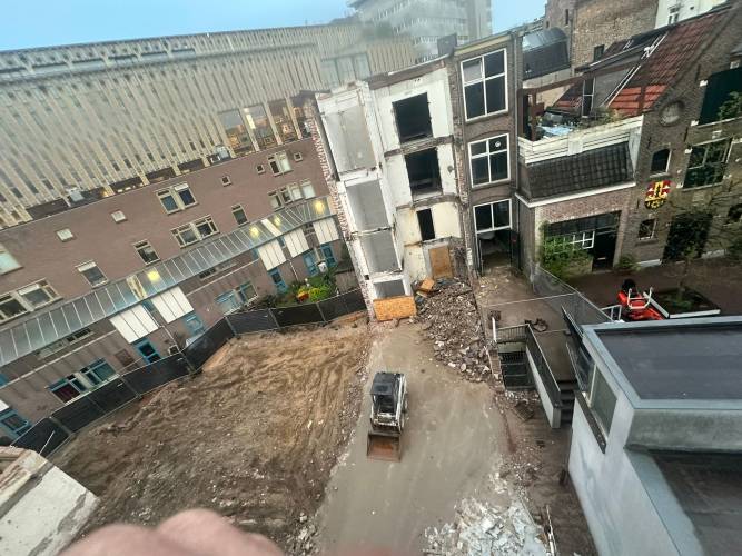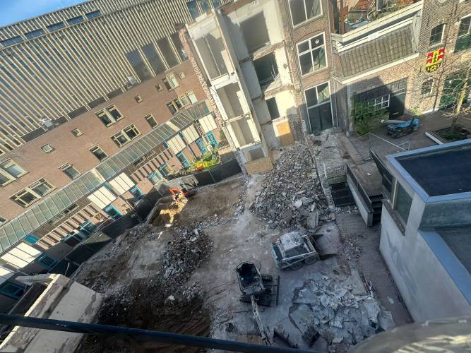 Op deze zogenoemde postzegel hebben wij vier verdiepingen tussen de bestaande gebouwen uitgesloopt. Aansluitend zijn de aanwezige keldervloer gesloopt en de grond uitgegraven, zodat de kelder opnieuw kon worden ingericht volgens de huidige normen.